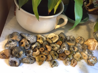 This was partly in recognition that they are - notwithstanding their relative abundance in Newhaven - rather special, and also to bring a little bit of seaside into the house deep in an inland winter.I might also have knotted them onto a cord in various ways to hang outside the door, to keep away witches and evil spirits. Or I could protect the house by attaching a hagstone to my keyring (although I find a bottle opener more useful). I could hang one around my neck to fend off impish tricks. Perhaps my bathroom is particularly protected, as I have long had a hagstone as the pull on the end of the light switch cord.